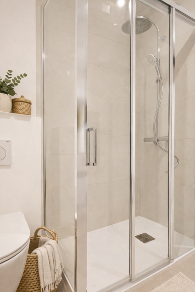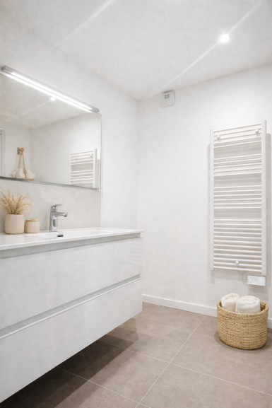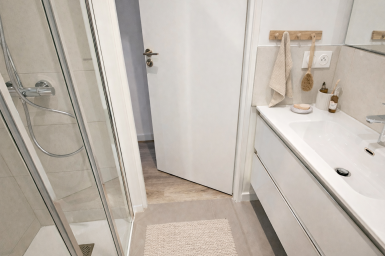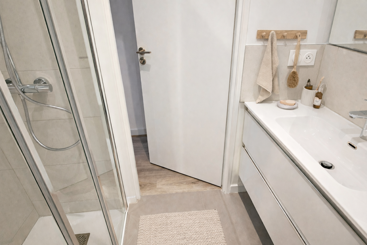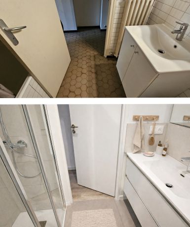 **Salle de bains entièrement rénovée** : remplacement de la baignoire par une douche moderne avec paroi vitrée coulissante et jolie mobilier vasque.